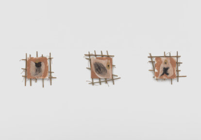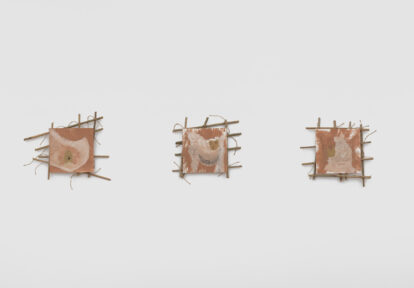 Earth, chalk and tinted charcoal on paper mounted on a bamboo and sisal rope lattice