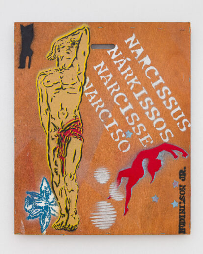 Primeiro, uma erotização explícita e direcionada: sob seu olhar, cada imagem — de esculturas gregas e renascentistas a super-heróis de quadrinhos; de colunas arquitetônicas a figuras mitológicas como minotauros e cupidos; de retratos a fragmentos anatômicos explícitos — é transformada em instrumento de sedução e voyeurismo. Segundo, lemas provocativos e táteis: frases como Espelhe-me! e Ahhh! Beije-me! desfazem papéis fixos de observador e observado, emitindo um convite aberto e coletivo. Misturadas a tags como “Hudinilson Jr.” e “Narcisse”, essas frases viraram sua assinatura urbana. Terceiro, e de maneira mais profunda, a figura de Narciso, um topos mitológico que o artista continuamente convocava, adotava e incorporava. Pelo olhar de Narciso, Hudinilson Jr. via de outra forma: Narciso entorpece os sentidos; a realidade se torna psicodélica, um jogo promíscuo entre olhar, corpo e imagem, em que o desejo cru e a pulsão de morte coexistem.