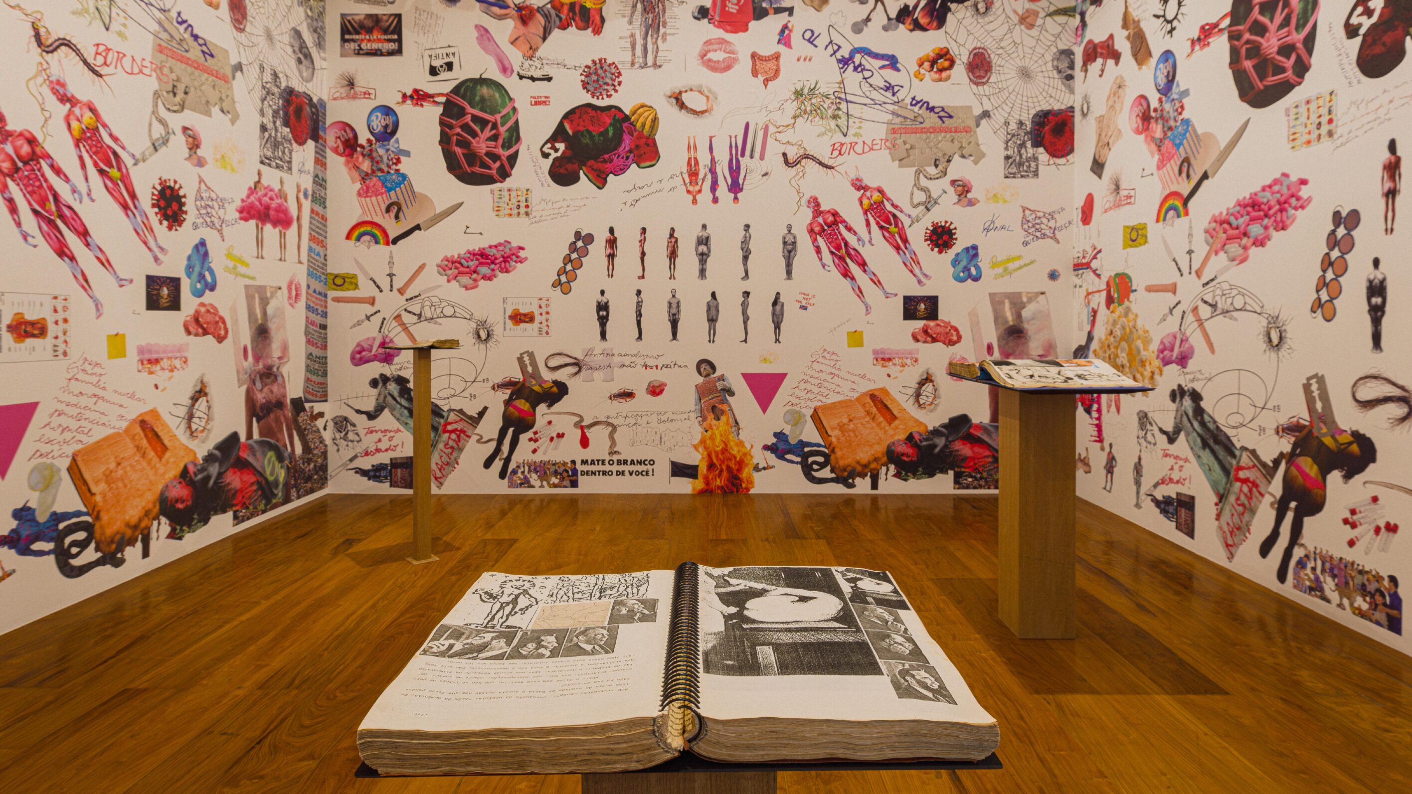 É dessa extrapolação – que eu, aqui, nomeio “desejo negativo” – que se trata essa exposição. A obra de Hudinilson Jr, especialmente os Cadernos de Referência, ora já situada numa certa escala de reconhecimento internacional, é apresentada aqui como um outro plano de extrapolação. Elaboradas desde – e contra – a posição social de um artista bicha cis gay branco da classe média paulistana, obcecado pelas rachaduras no espelho narcísico, as obras de Hudinilson Jr podem, apenas, ganhar pleno sentido quando recontextualizadas por ecos e dissonâncias que se estendem à sua passagem pela vida. Não se trata de tecer um plano de reverência, e de buscar traçar uma historiografia que assume a obra do paulistano como gênese. Antes, trata-se de trazer Hudinilson de volta à rua dos processos transformativos aos quais ele foi sensível.