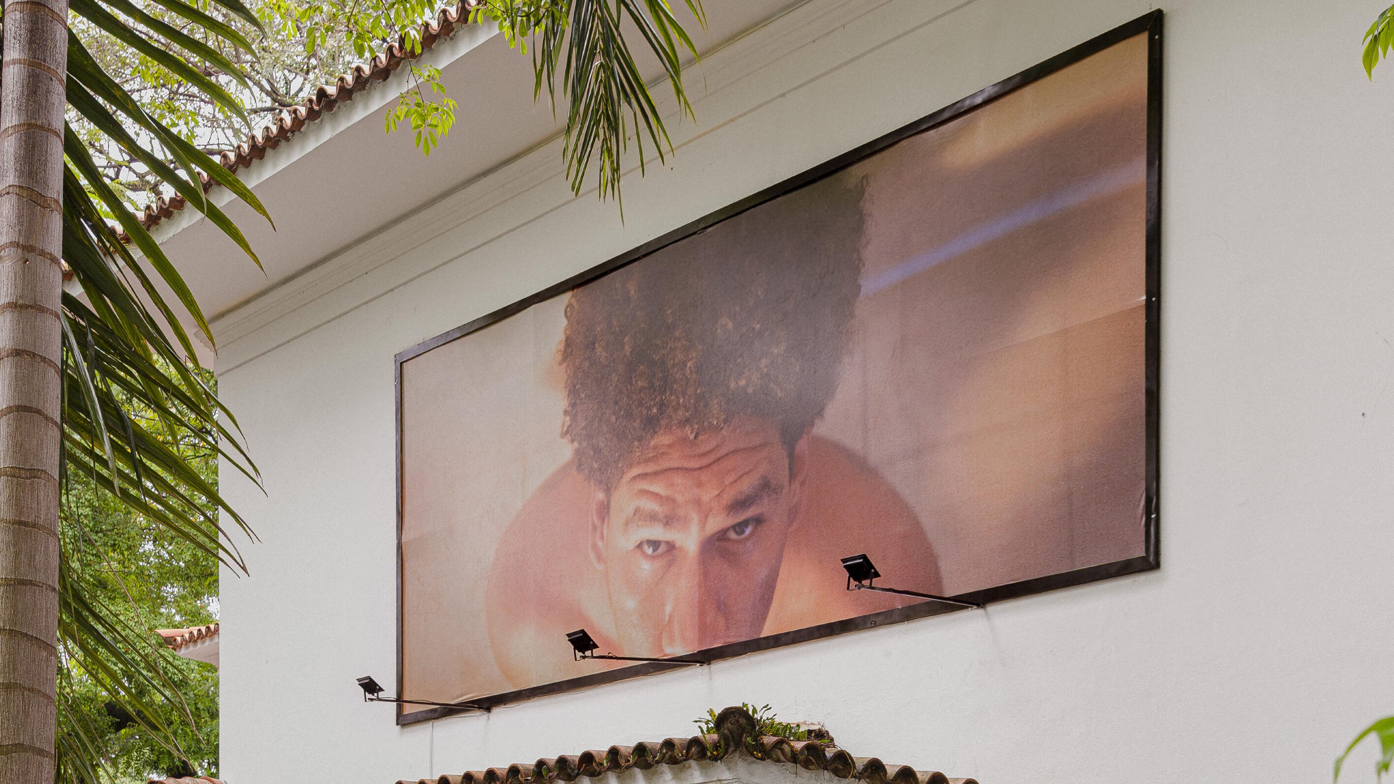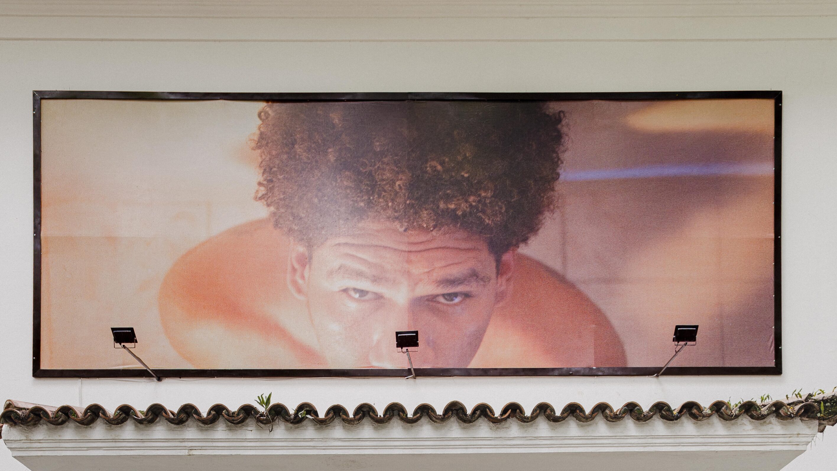 Em bote (por uma noite apenas ou até que a morte nos separe), 2025, o retrato de tetê está cortado bem em baixo do nariz. Com a boca desenquadrada, o bote é total, porque não se sabe exatamente o que está a ser abocanhado – e poderia mesmo ser qualquer coisa. A obra se apresenta como um billboard fixado à fachada da galeria, numa relação perpétua com a rua. A relação com o exterior não retira o caráter íntimo da fotografia, que oculta mais do que revela, apesar da luz estourada e da escala monumental. Mais até do que o que estamos vendo, o trabalho nos obriga a pensar sobre o que tetê vê. Por que esses olhos úmidos? Como pode ser que uma tal vulnerabilidade corte, rasgue a tela?